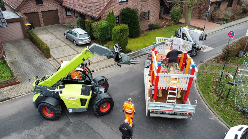 Für das millimetergenaue Absetzen des schweren Spielgeräts kam ein großer Teleskoplader der Firma TCA Alpen zum Einsatz – kostenfrei zur Verfügung gestellt.