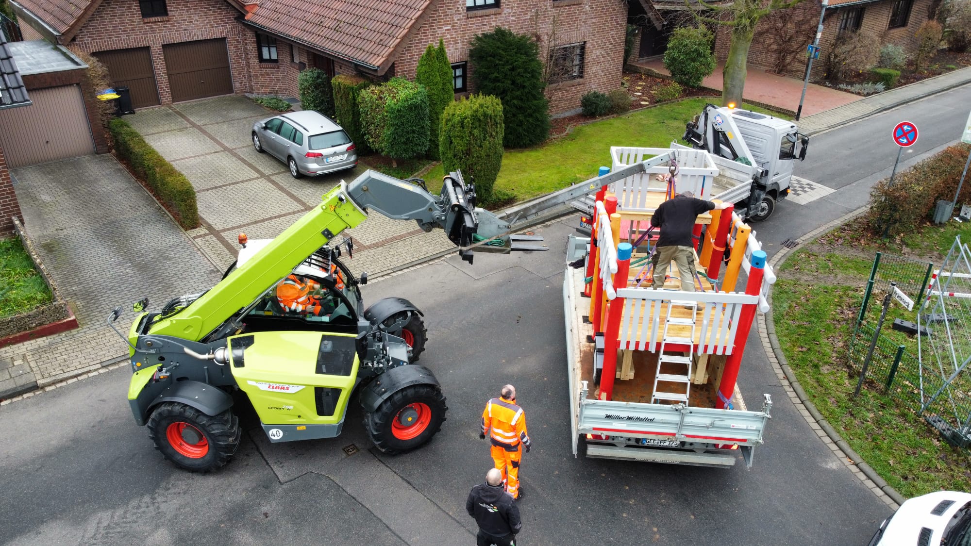 Heute war es so weit: Das frisch fertiggestellte Spielgerät trat seine Reise von Mikes Werkstatt zu seinem neuen Standort in Veen an. Dort wurde es vom Bauhof der Gemeinde Alpen in Empfang genommen.