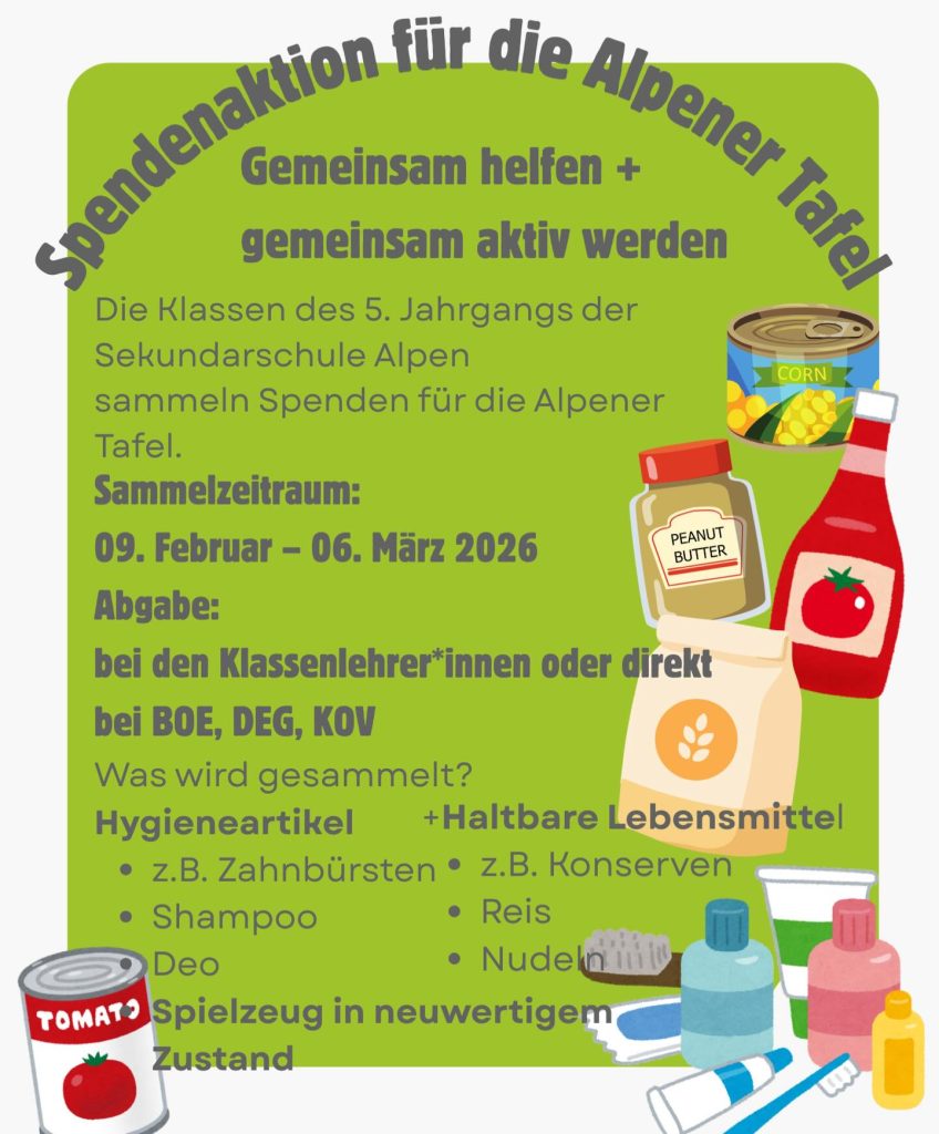 Mit viel Engagement, Herz und Teamgeist setzen sich die Klassen 5a, 5b und 5c der Sekundarschule Alpen für einen guten Zweck ein. Im Rahmen einer großen Spendensammelaktion zugunsten der Tafel Alpen werden vom 09.02.2026 bis zum 06.03.2026 dringend benötigte Sachspenden gesammelt. Ziel ist es, Menschen in der Region zu unterstützen, die auf Hilfe angewiesen sind – ein starkes Zeichen für Zusammenhalt und Mitmenschlichkeit.