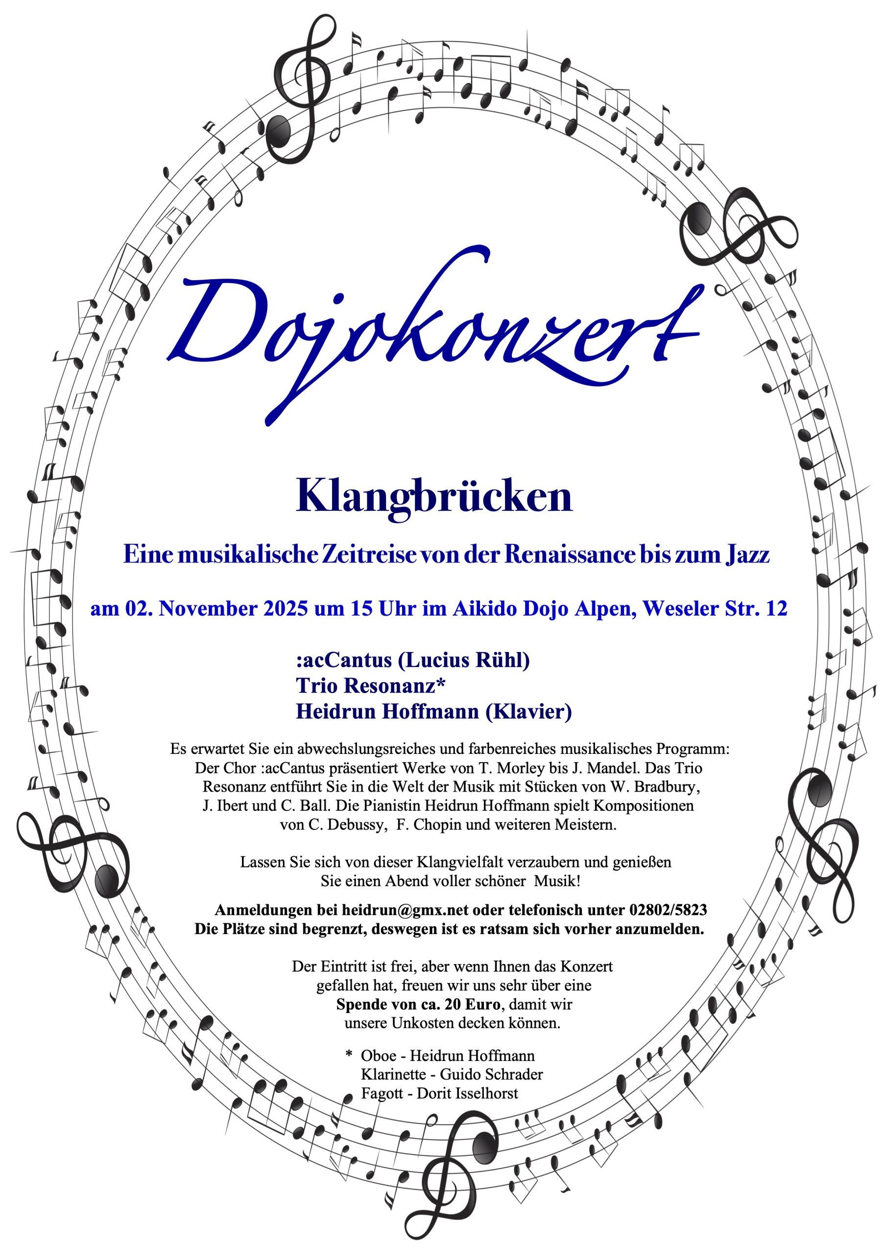 Am Sonntag, den 2. November 2025 um 15 Uhr, lädt der Aikido Dojo Alpen e.V. zu einer weiteren Auflage unserer beliebten Dojokonzerte ein. Dieses Mal steht der Nachmittag unter dem Motto