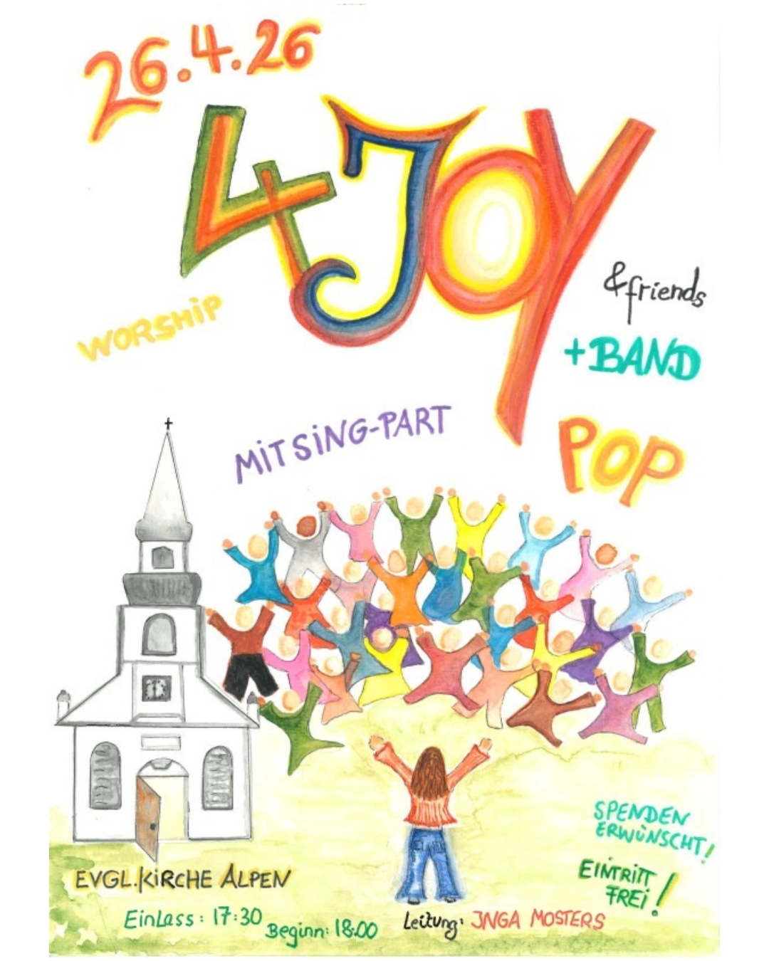 Ein besonderes Konzert erwartet euch am 26.4.26: Um 18:00 Uhr lädt der Chor 4Joy zu einem stimmungsvollen Konzert in die Evangelische Kirche Alpen ein.