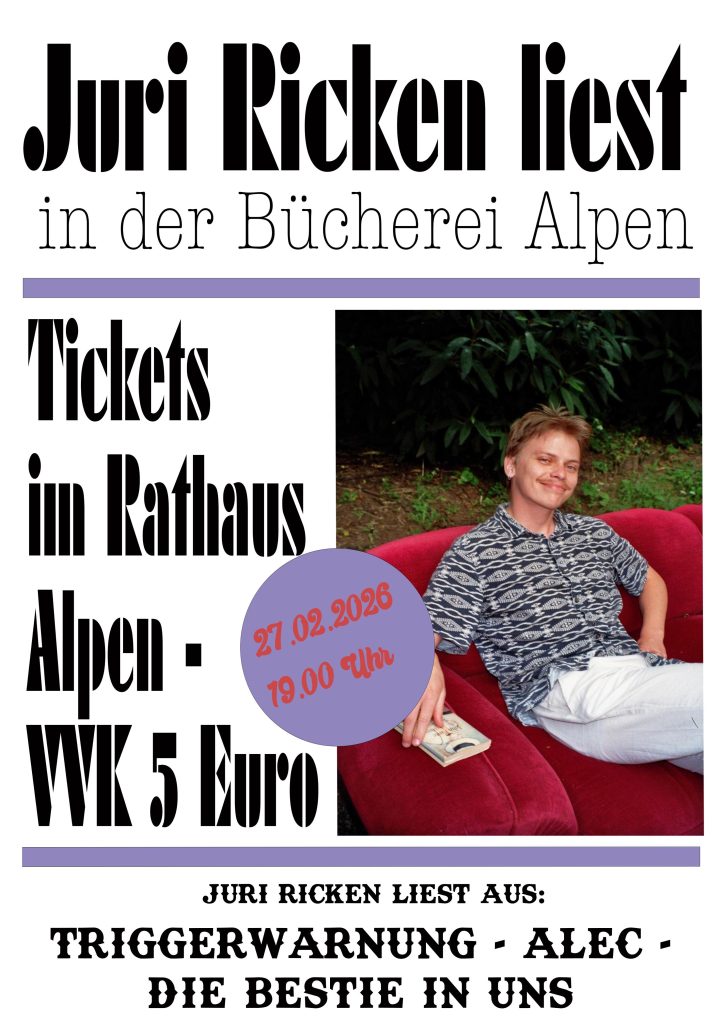 Im Mittelpunkt der Lesung stehen Auszüge aus den Büchern „Triggerwarnung“, „Alec“ und „Die Bestie in uns“. Juri Ricken bewegt sich darin zwischen psychologischer Tiefe, gesellschaftlichen Konflikten und düsteren Erzählwelten – stets fiktional, pointiert und nicht ohne feinen Witz.